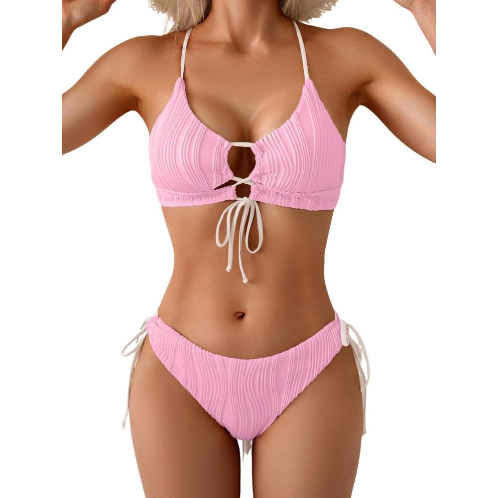 B2prity Women’s Sexy Bikini Set Color Block Lace Up 2 Piece Bathing Suit Tie Side Swimsuit(Pink)